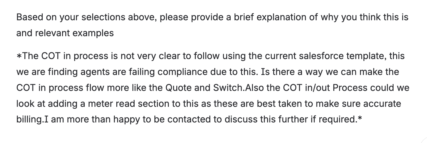 The compliance manager was responsible for ensuring customer care agents adhered to regulations, including reading terms and conditions to customers. They raised a concern that agents were missing key terms during the move-in process, as the terms and conditions were presented in a large, scrollable text box at the top of the page, making them easy to overlook.”